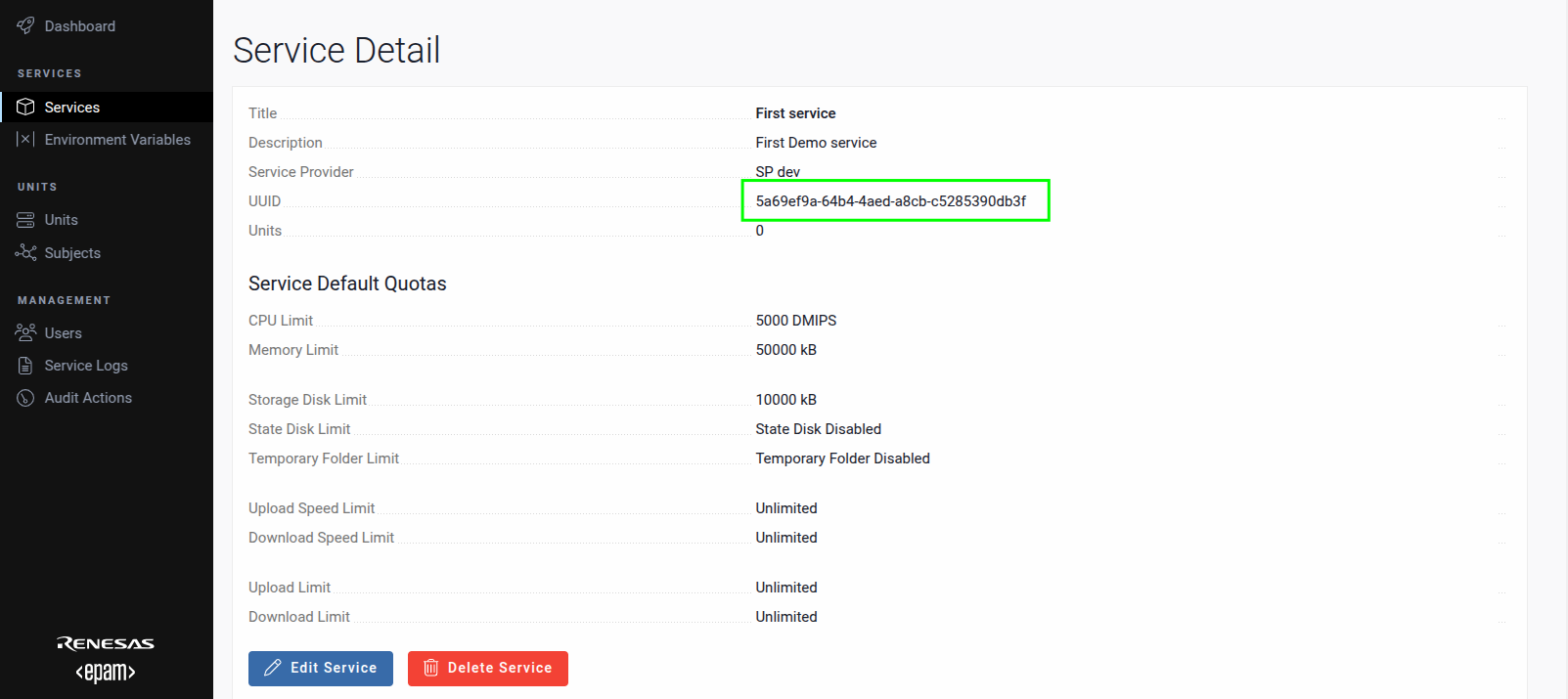 - After creating the service, click its title to enter the Service Detail screen, copy the value from the UUID field somewhere to reserve it for future use.